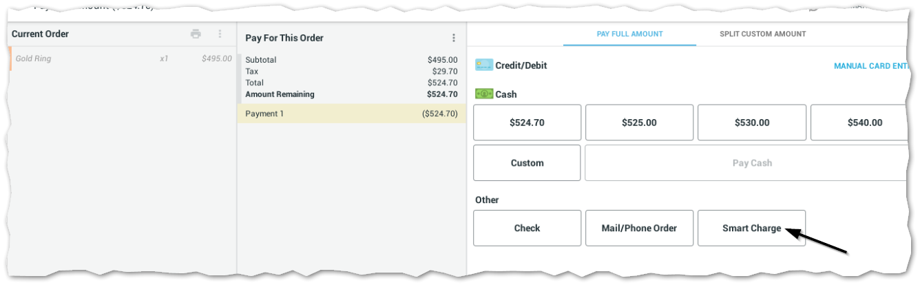 - After selecting "Pay" on the order there will be an additional button that says "Smart Charge" (see image below)